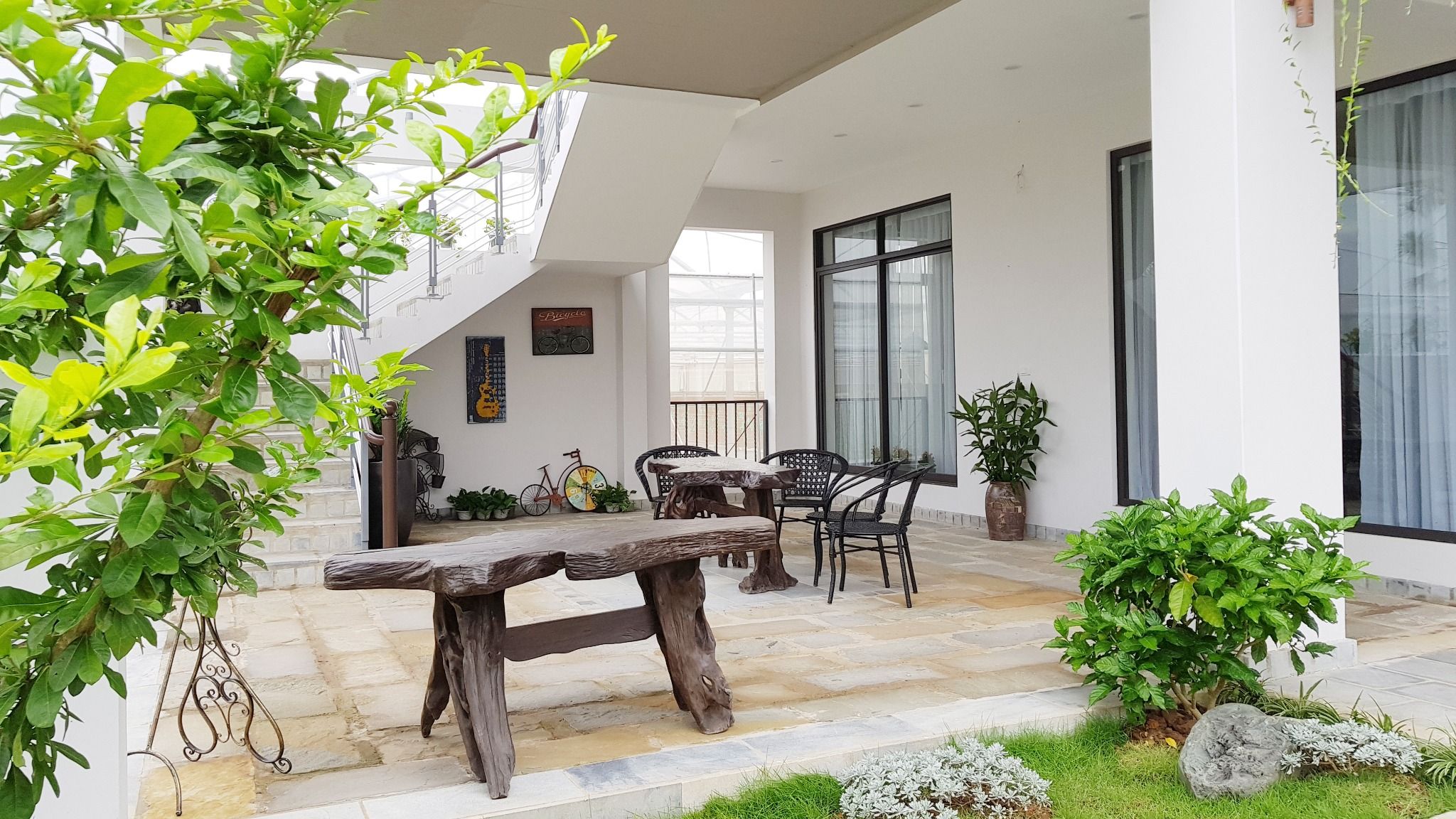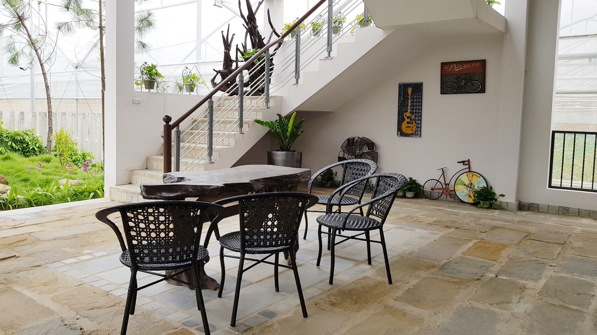 Đặc biệt, khơi nguồn cảm hứng từ sự thân thiện với môi trường, phần lớn vật dụng tại đây là nguyên liệu tự nhiên không qua sản xuất công nghiệp. Tất cả đá lát nền đều là những phiến đá hình thành từ bùn đất sét qua hàng triệu năm. Hay những chiếc bàn, ghế được chế tác hoàn toàn thủ công từ gỗ lũa ngâm bùn hàng trăm năm.